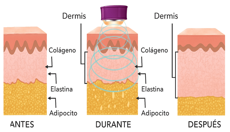 La radiofrecuencia estética corporal es un procedimiento no invasivo que utiliza energía electromagnética para generar calor controlado en las capas profundas de la piel y el tejido subcutáneo. Este proceso estimula la contracción inmediata de fibras de colágeno y promueve la producción de nuevo colágeno y elastina, mejorando la firmeza y textura de la piel.